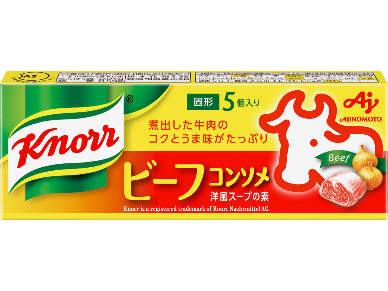 洋風スープの素「クノール® ビーフコンソメ」は、ビーフ原料をたっぷり使用した、ビーフの風味とうま味がつまった濃厚な洋風だしです。煮込み料理に深いコクと味わいを出します。固形タイプのみ発売しています。